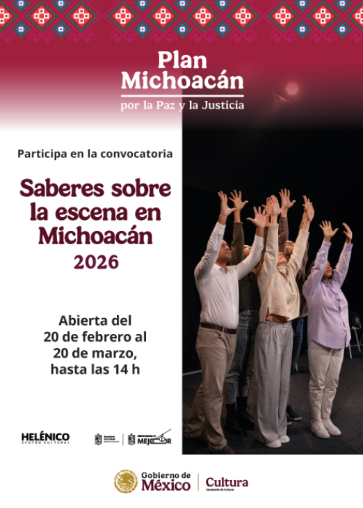 La Secretaría de Cultura del Gobierno de México, a través del Centro Cultural Helénico y la Secretaría de Cultura de Michoacán, convocan a artistas escénicos del estado de Michoacán a participar en: