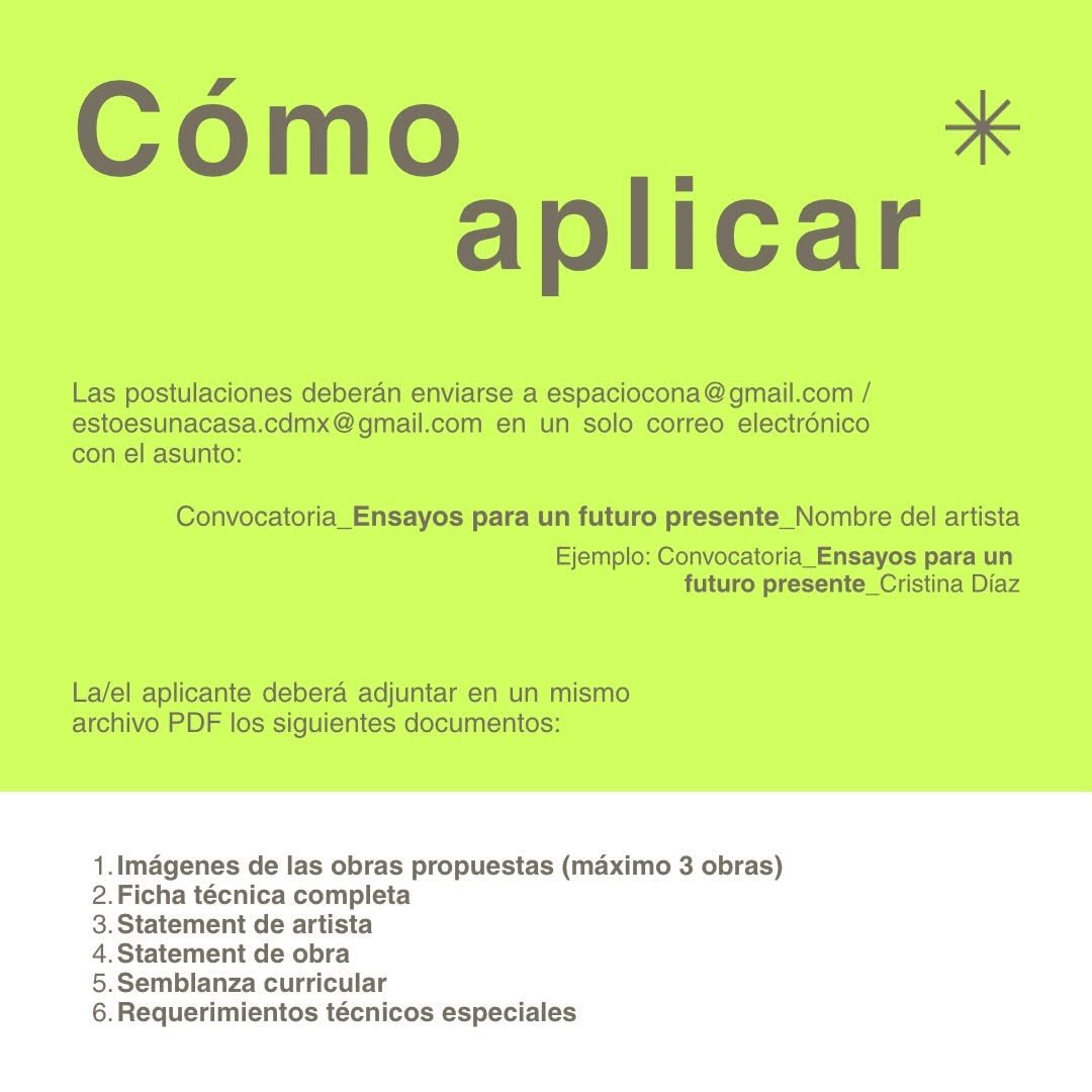 Galeria Lobby, en colaboración con @estoesunacasa convoca a artistas que residen en México a participar en la exposición colectiva “Ensayos para un futuro presente”, que se llevará a cabo del 27 de marzo al 24 de abril en el marco del segundo aniversario de Espacio Cona.