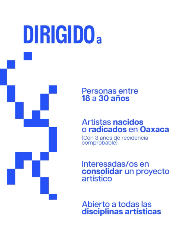 La convocatoria está dirigida a artistas de 18 a 30 años, nacidos o radicados en el estado de Oaxaca, interesados en consolidar un proyecto artístico individual o colectivo, y está abierta a todas las disciplinas artísticas.