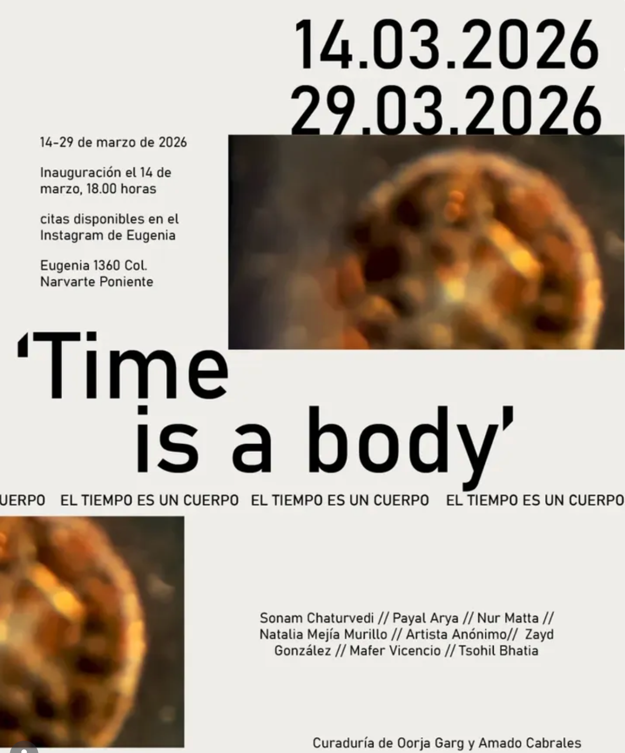🆃🅸🅼🅴 🅸🆂 🅰 🅱🅾🅳🆈 (El tiempo es cuerpo) imagina el tiempo como una coreografía de movimientos que atraviesan escalas, corporalidades y memorias. Frente a la idea lineal del progreso, la exposición propone una temporalidad relacional donde el tiempo vuelve al cuerpo. Artistas de India, México y Colombia proponen formas de percibir, cuestionar y encarnar el tiempo en su sentido plural.