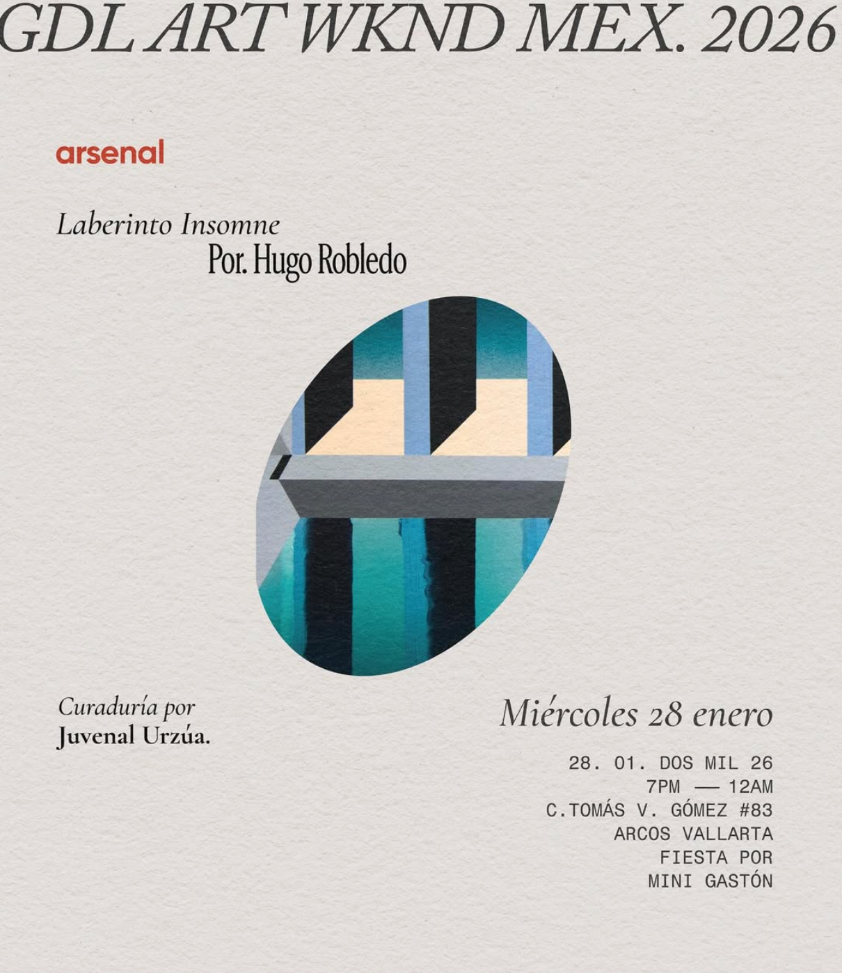 LABERINTO INSOMNE es la primera exposición individual de Robledo en Jalisco, curada por Juvenal Urzúa, y que inaugura nuestra nueva sede en Arsenal.