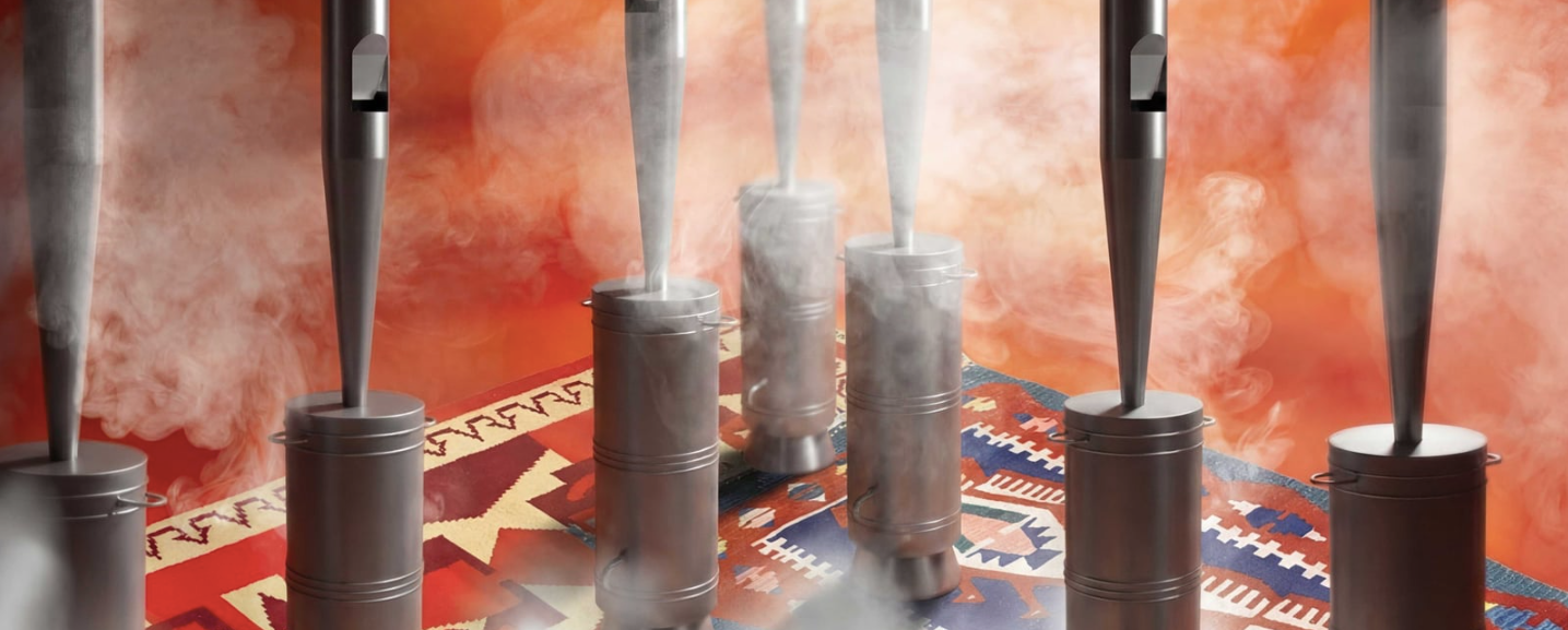 La instalación central toma la forma del samovar, el recipiente para calentar y tomar té, característico de oriente —desde Turquía hasta Rusia y Asia Central—, encarnando un gesto de hospitalidad y encuentro. El espacio expositivo se mantendrá en ebullición, tanto literal como oralmente, y habrá una serie de publicaciones dispuestas sobre rahlé —soportes en forma de “X” tradicionalmente utilizados para sostener escrituras sagradas durante la lectura o recitación—, así como kilims para sentarse.