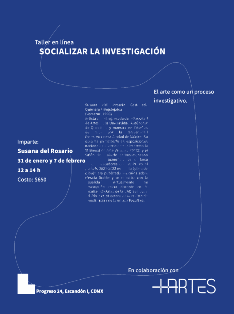 Taller en línea que explora la obra de arte como un proceso investigativo. La construcción de conocimiento desde y para la producción artística. Escribir sobre arte, sobre la obra y sobre los procesos. Por: Susana del Rosario @ejelejalea